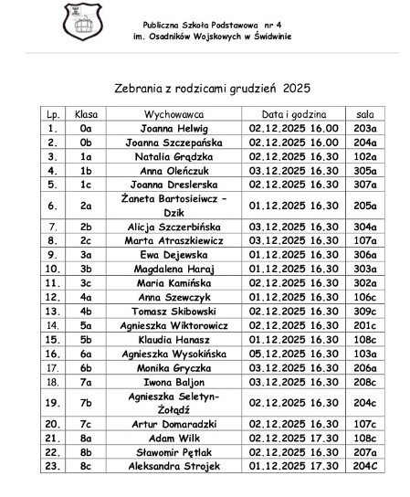 Lista dzieci przyjętych do zerówki w roku szkolnym 2025/2026 w Publicznej Szkole Podstawowej nr 4 im. Osadników Wojskowych w Świdwinie